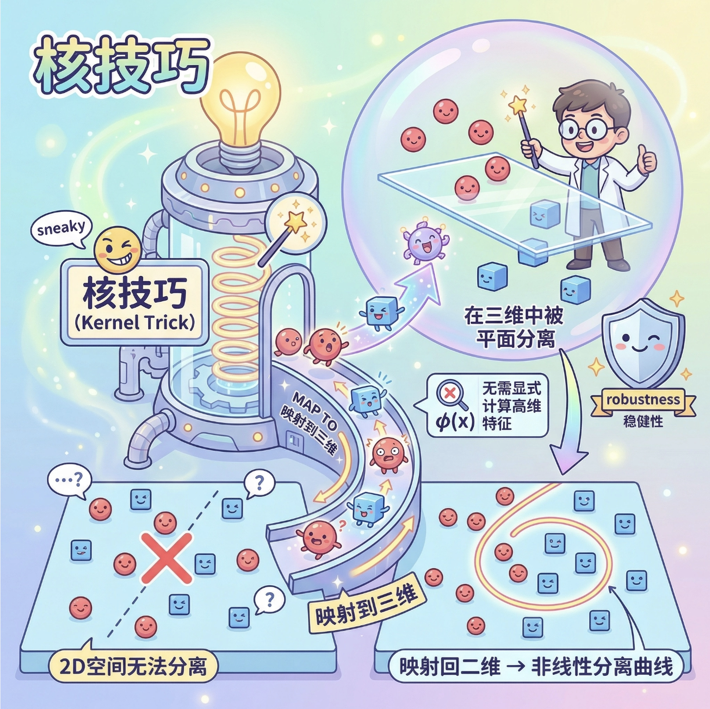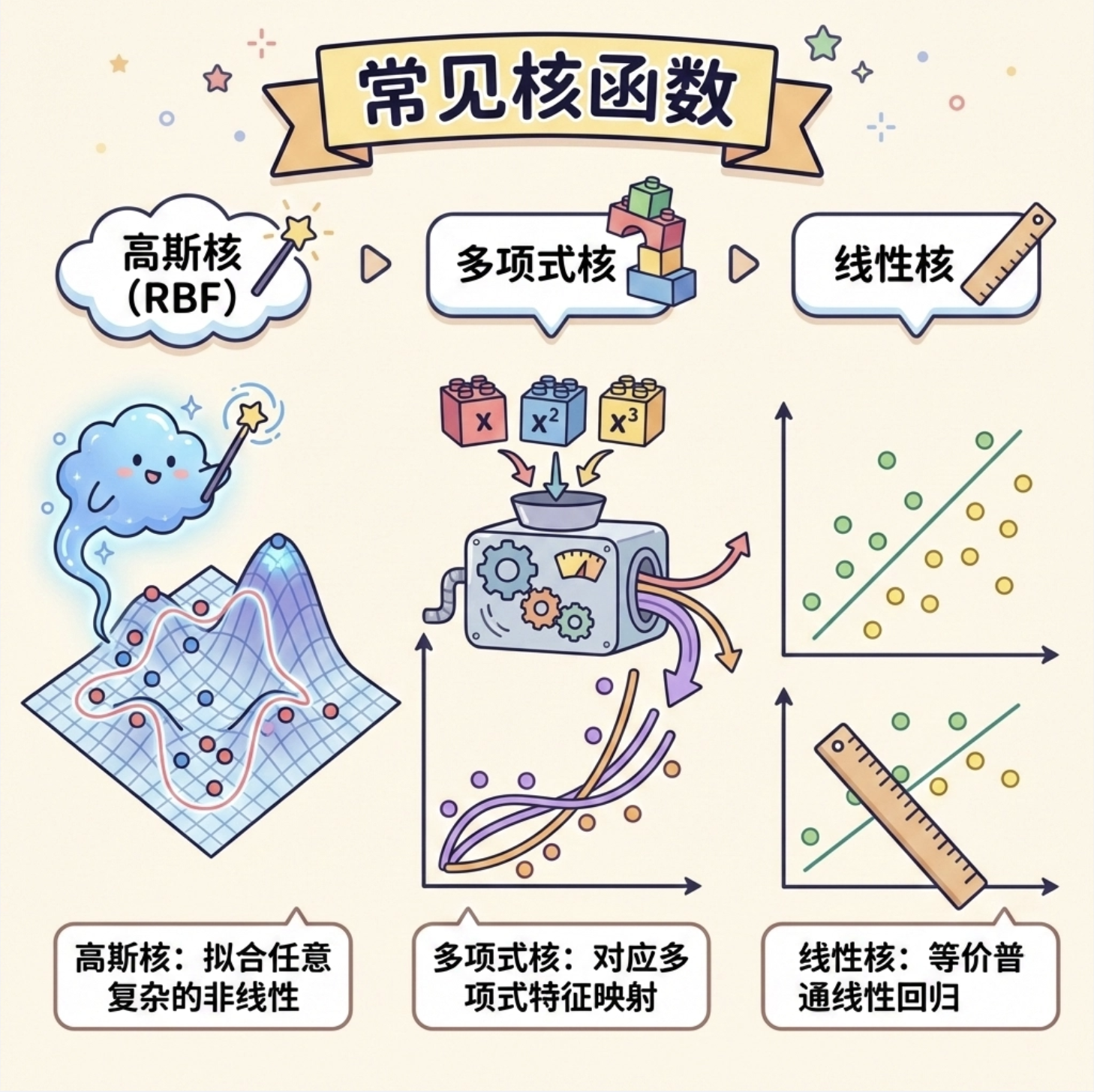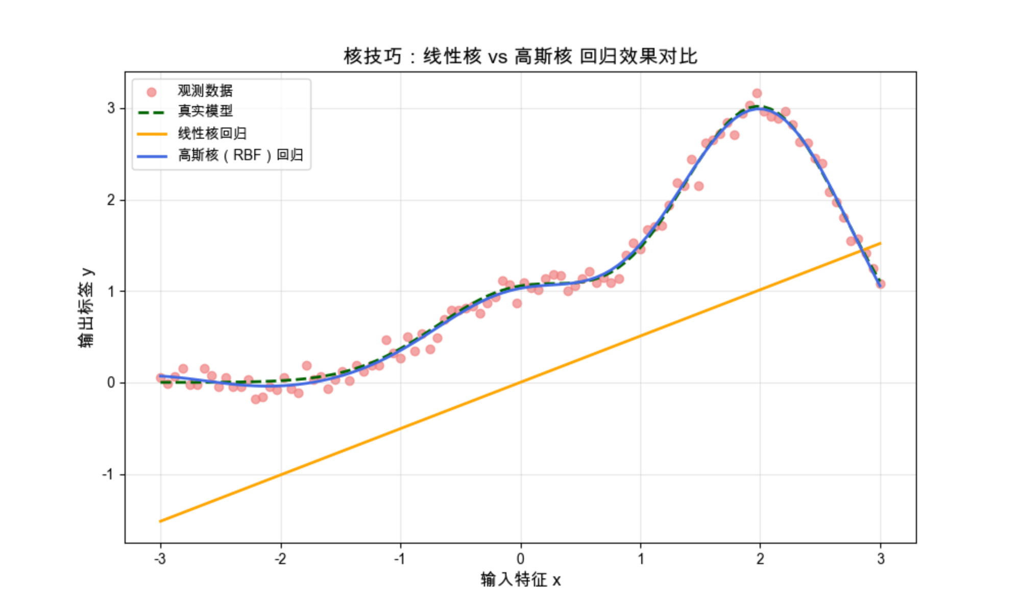2.核技巧的 Trade-off:高斯核拟合能力强,但容易过拟合;线性核简单稳定,但只能处理线性关系;
