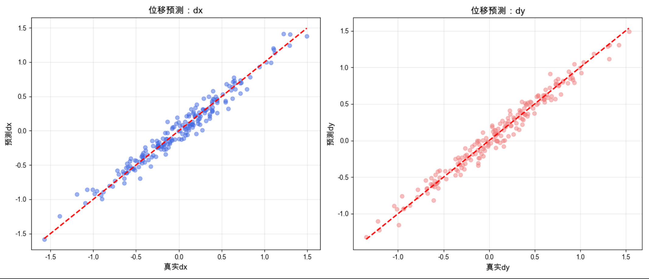 两张子图分别展示 dx 和 dy 的预测效果,散点越靠近红色虚线,说明位移预测越准确,模拟了「位移专家」的核心逻辑。