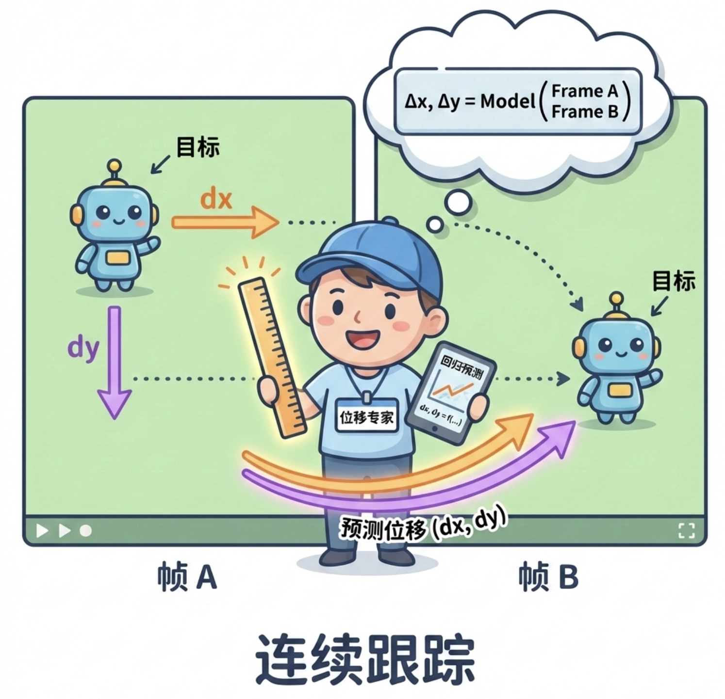 位移专家(Displacement Expert)是目标跟踪中的核心技术:用回归模型预测目标在相邻帧中的位移(dx, dy),从而实现目标的持续跟踪。