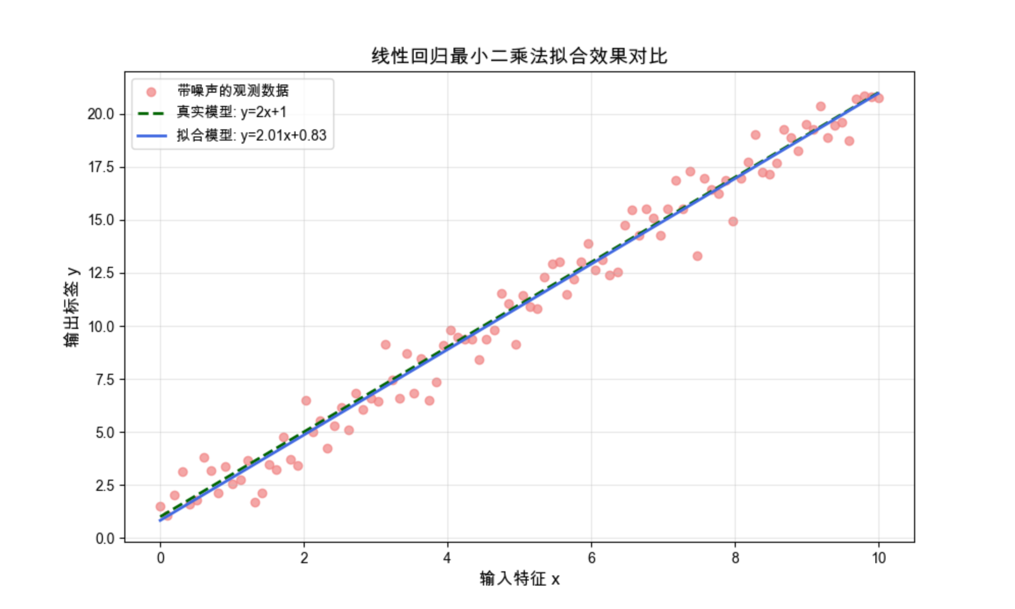 - 绿色虚线:真实的 y=2x+1;