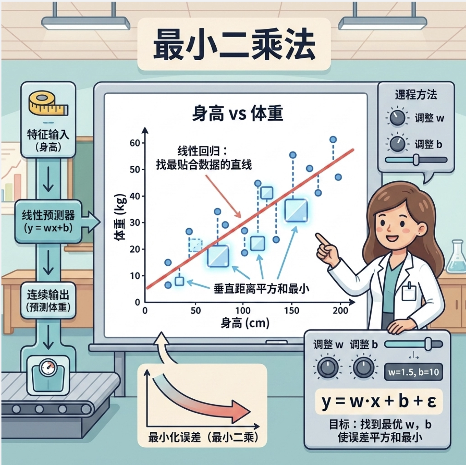 最小二乘法是线性回归最常用的求解方法,核心是「让所有数据点到直线的垂直距离平方和最小」。