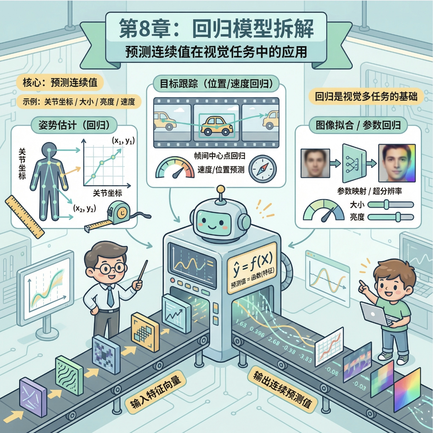 大家好!今天我们来拆解《计算机视觉:模型、学习和推理》这本经典教材的第 8 章 ------ 回归模型 。回归是计算机视觉中最基础也最核心的技术之一,不管是人体姿势估计、目标跟踪还是图像拟合,都离不开回归的身影。