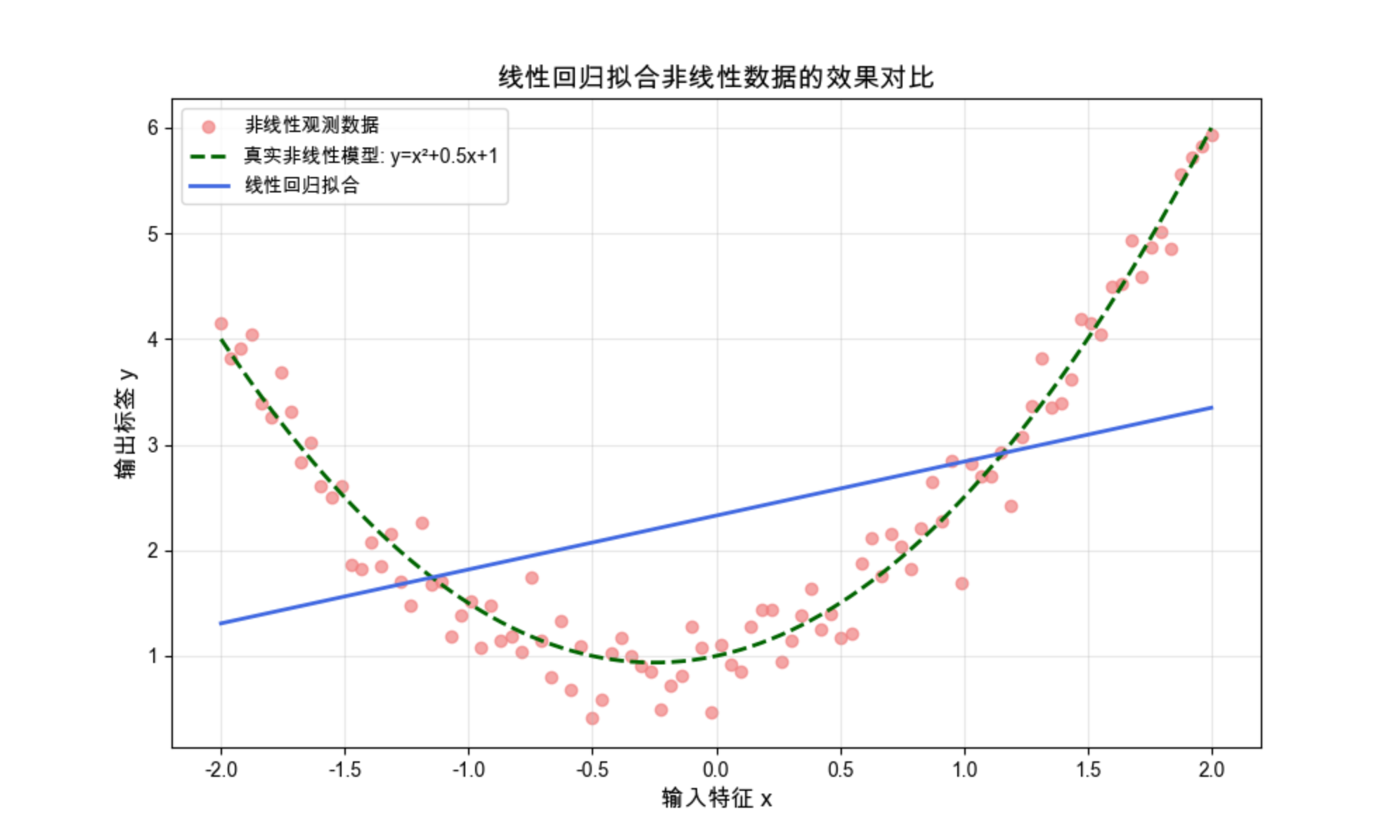 能明显看到:线性回归的直线完全无法贴合二次函数的曲线,这就是线性回归的核心局限性。