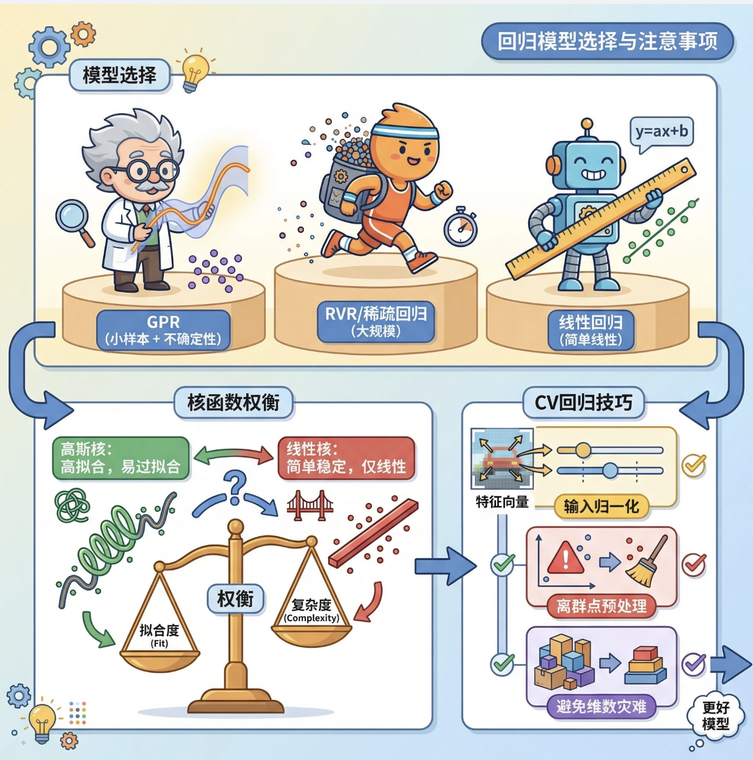 1.回归模型的选择:小样本、需要不确定性估计选 GPR;大规模数据选稀疏回归 / RVR;简单线性关系选普通线性回归;