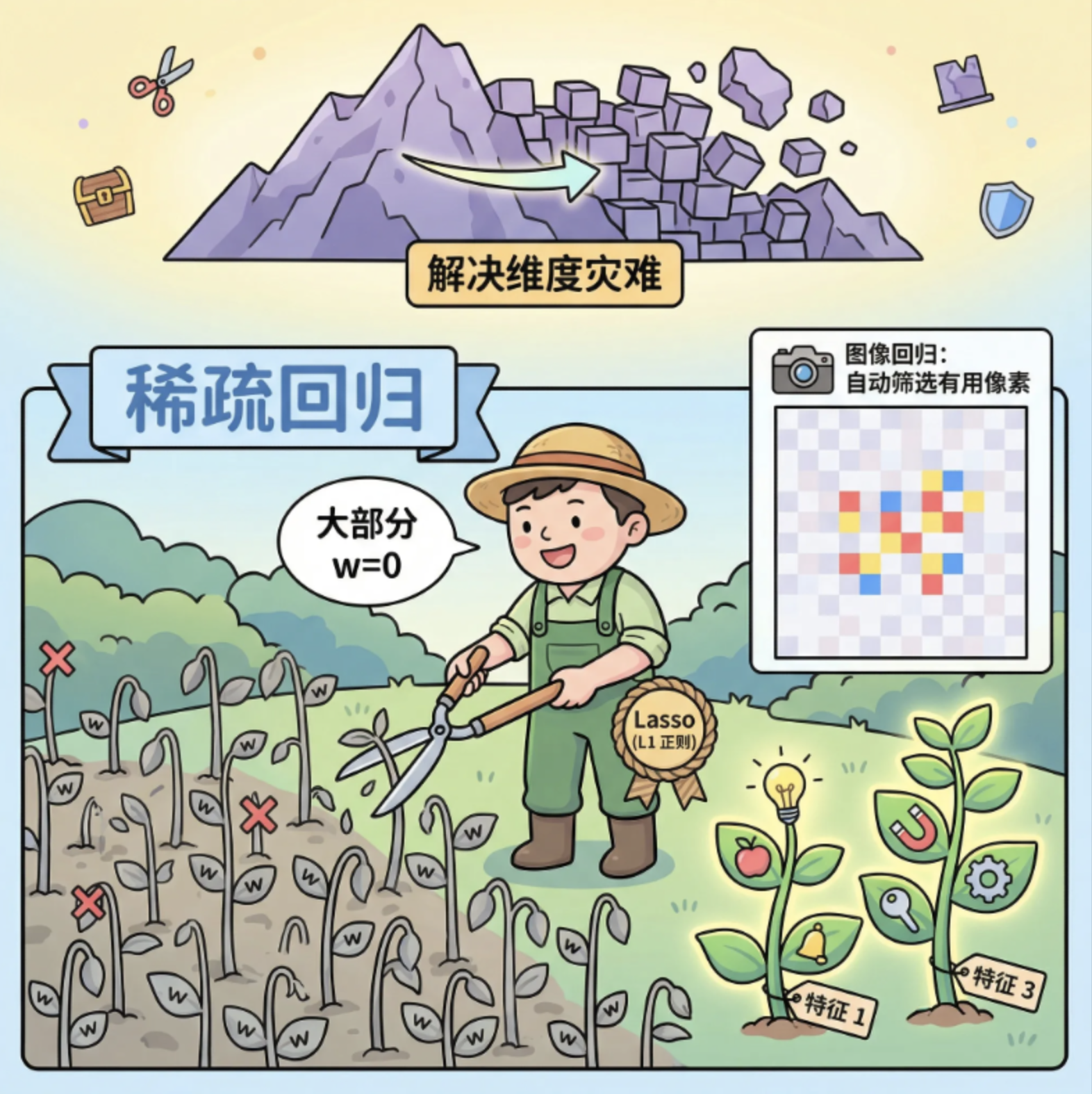 - 过拟合风险 :当特征维度远大于数据量时,模型会「死记硬背」噪声,泛化能力差;