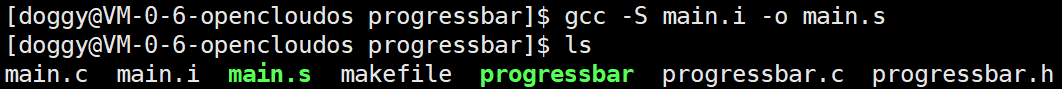 使用-S选项对main.i进行编译,使用-o选项输出已生成汇编的main.s文件(编译)