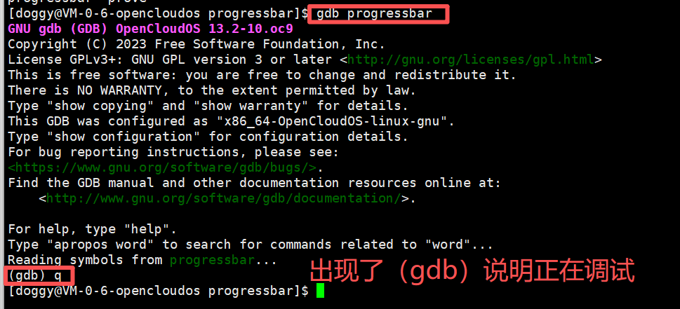 使用"gdb 文件名"进入调试模式,若指令行开头出现[gdb]说明成功进入,不成功可能是编译不通过或该文件不是debug版本的