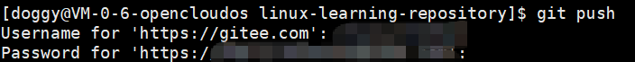 最后使用**"git push"** 将文件同步到远端服务器上,此处需要填写git的用户名和密码