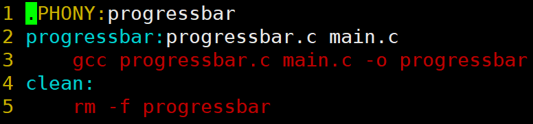 第一行结构为 A:B A是目标文件 B是源文件,这里想要达成的目的是将progressbar.c和main.c编译得到progressbar文件