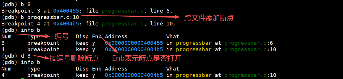 使用 " b " (break)来增加断点,使用 "info b " (infomation)来查看所有断点信息,使用"d 断点编号"(delete)删除相应断点断点,和跨文件查看类似,用"b 文件名:行号 "跨文件添加断点