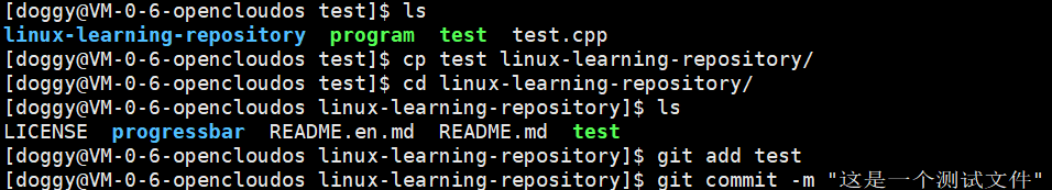 首先将需要提交的文件拷贝到仓库路径下,这里演示提交test文件,随后使用**"git add "** 待上传的文件名"将需要用 git 管理的文件告知 git,再使用**"git commit -m "** 要填写的日志内容""提交改动到本地,-m选项用于添加日志,一定要带上,日志也不要乱写
