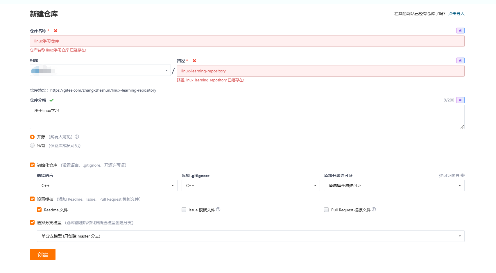 在gitee注册账号,然后点击右上角的+号创建仓库,可以按照下图配置