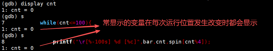 使用"p 变量名 "添加变量监视,如果需要让监视变量保持显示,使用"display 变量名 "让变量常显示,使用"undisplay 变量名"取消常显示