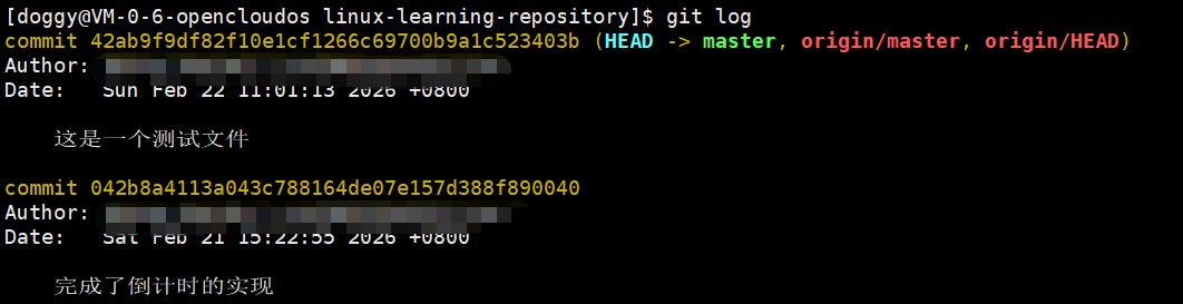 注意第一次在linux上使用git时,在commit那一步系统会提示需要配置用户名和邮箱,按提示操作即可