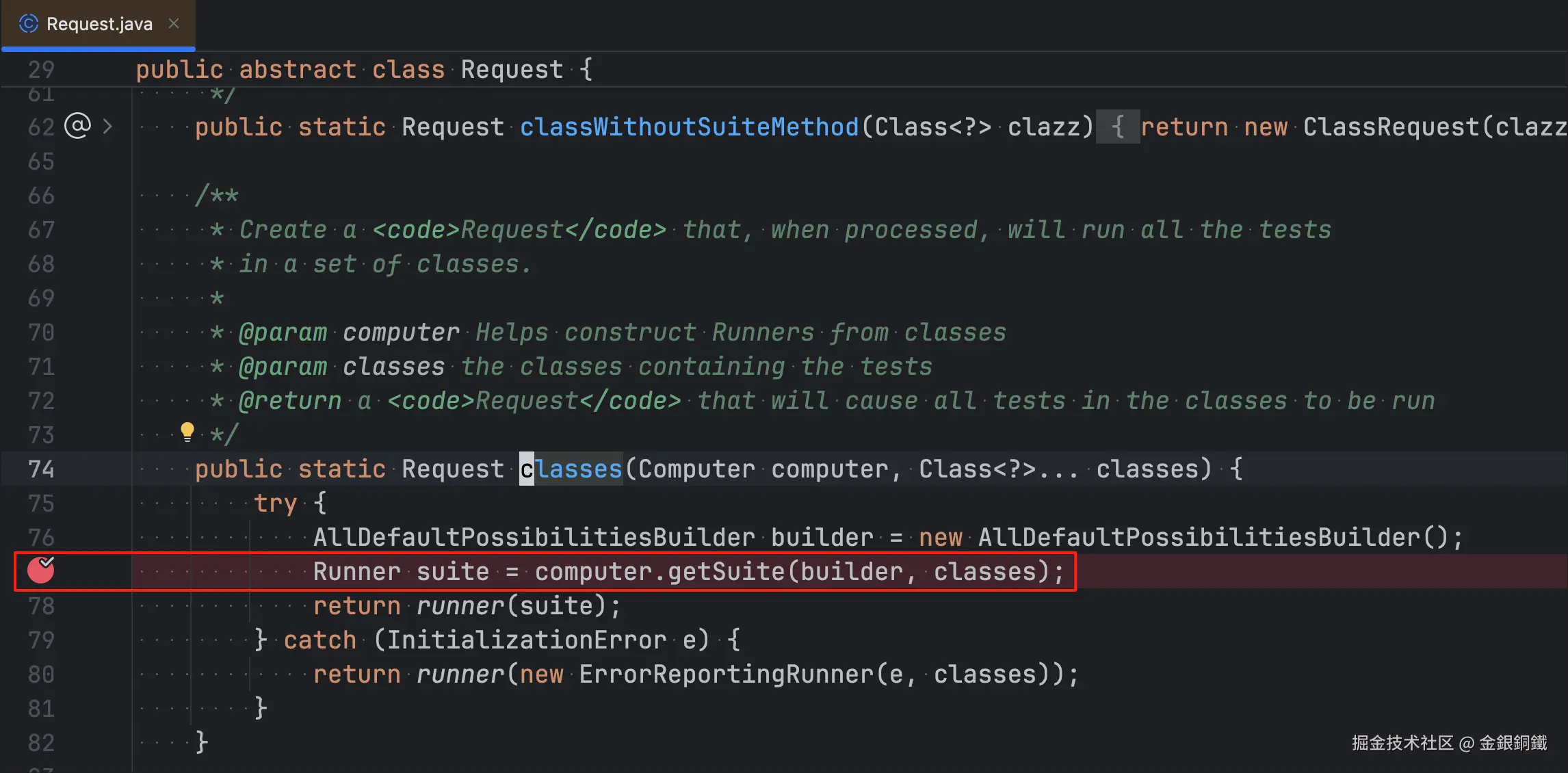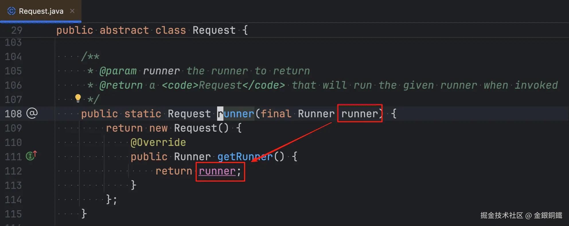 这个方法的 request 参数是通过 Request 类中 runner(final Runner runner) 方法构造的,所以我们可以简单将 Request 视为 Runner 的包装 ⬇️