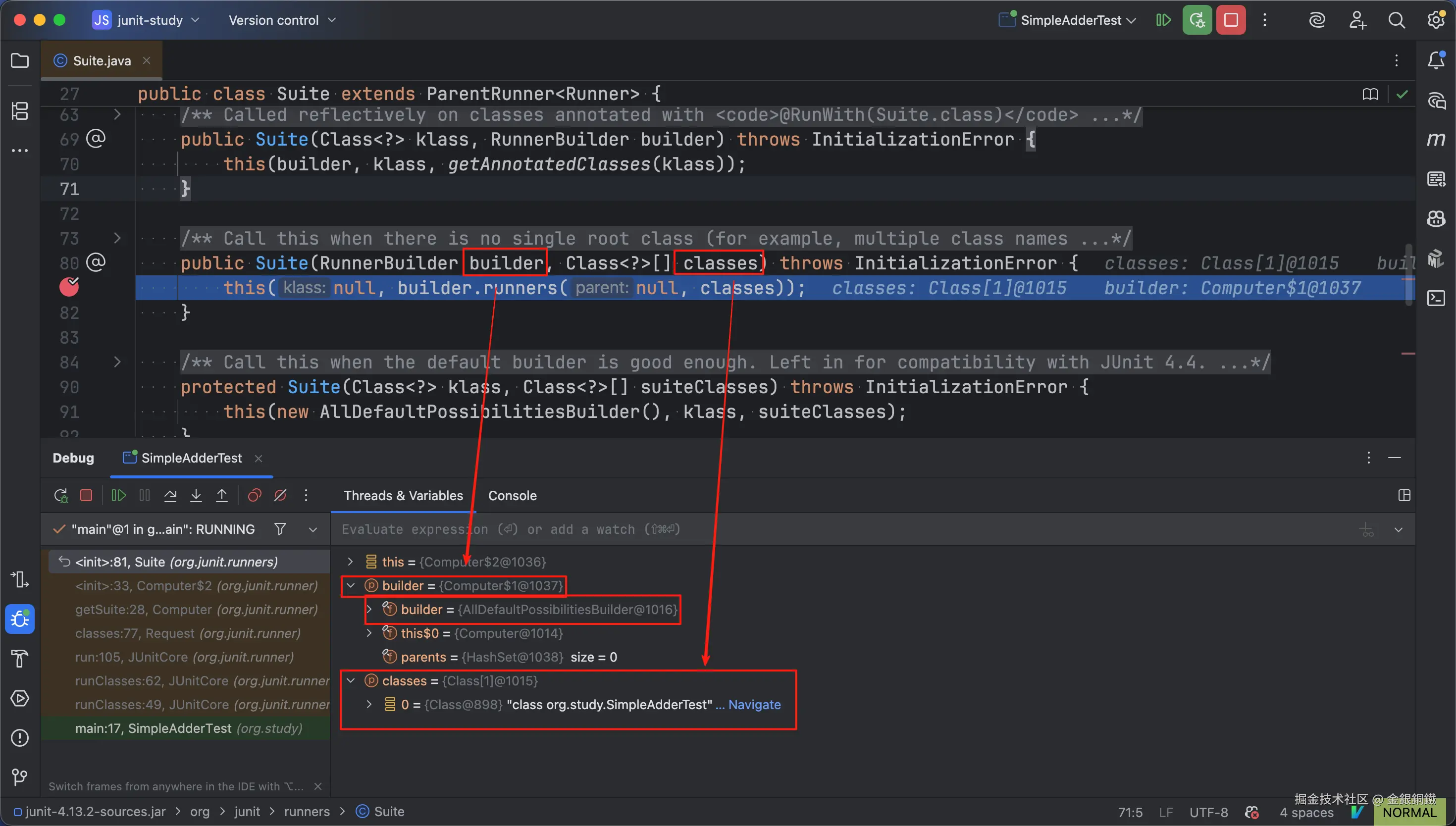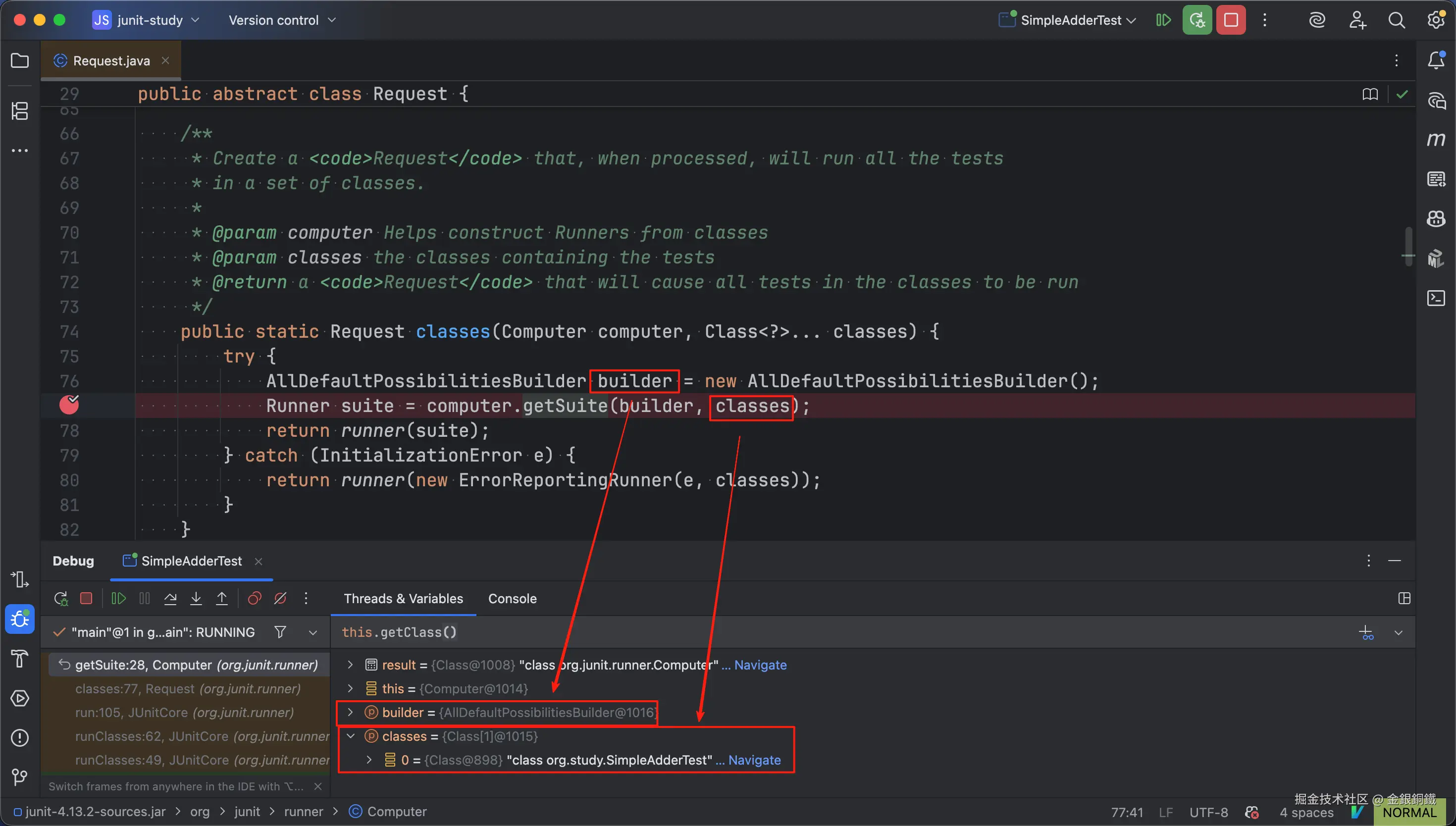builder变量是RunnerBuilder的一个匿名子类的实例(它可以访问一个AllDefaultPossibilitiesBuilder的实例)classes变量是一个数组(其中只有一个元素:org.study.SimpleAdderTest.class)