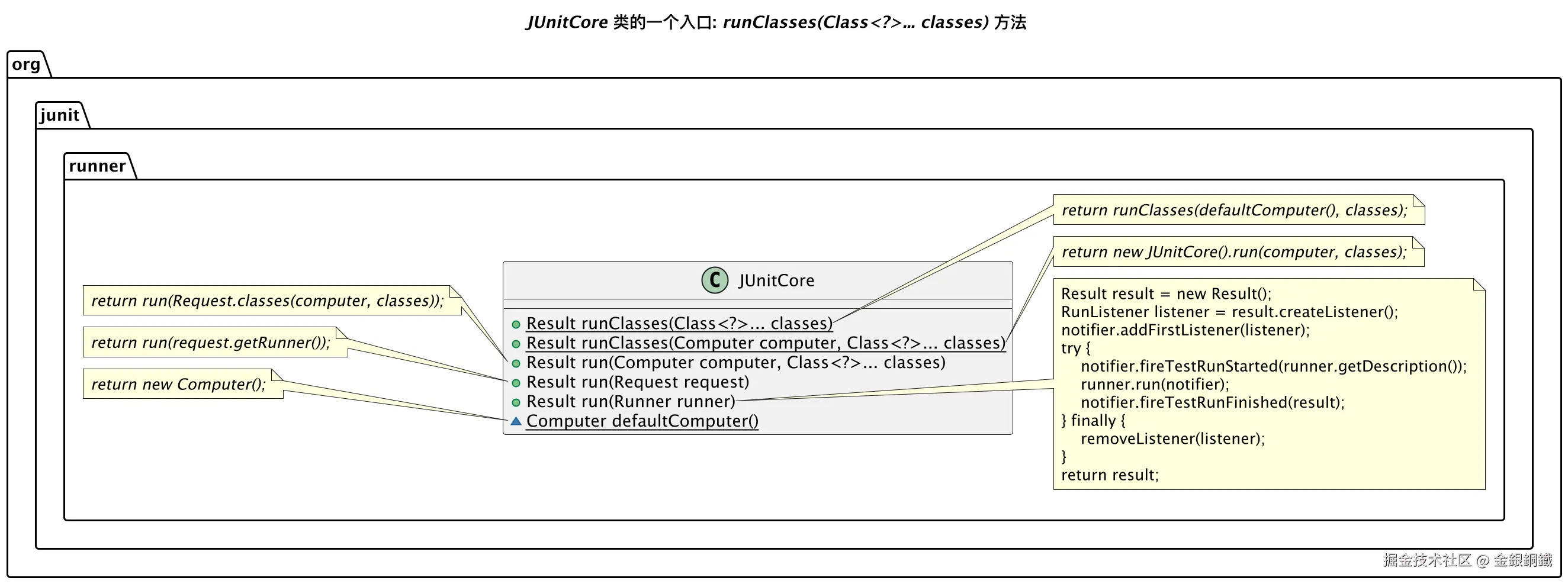画"JUnitCore 类的一个入口: runClasses(Class<?>... classes) 方法"一图所用到的代码