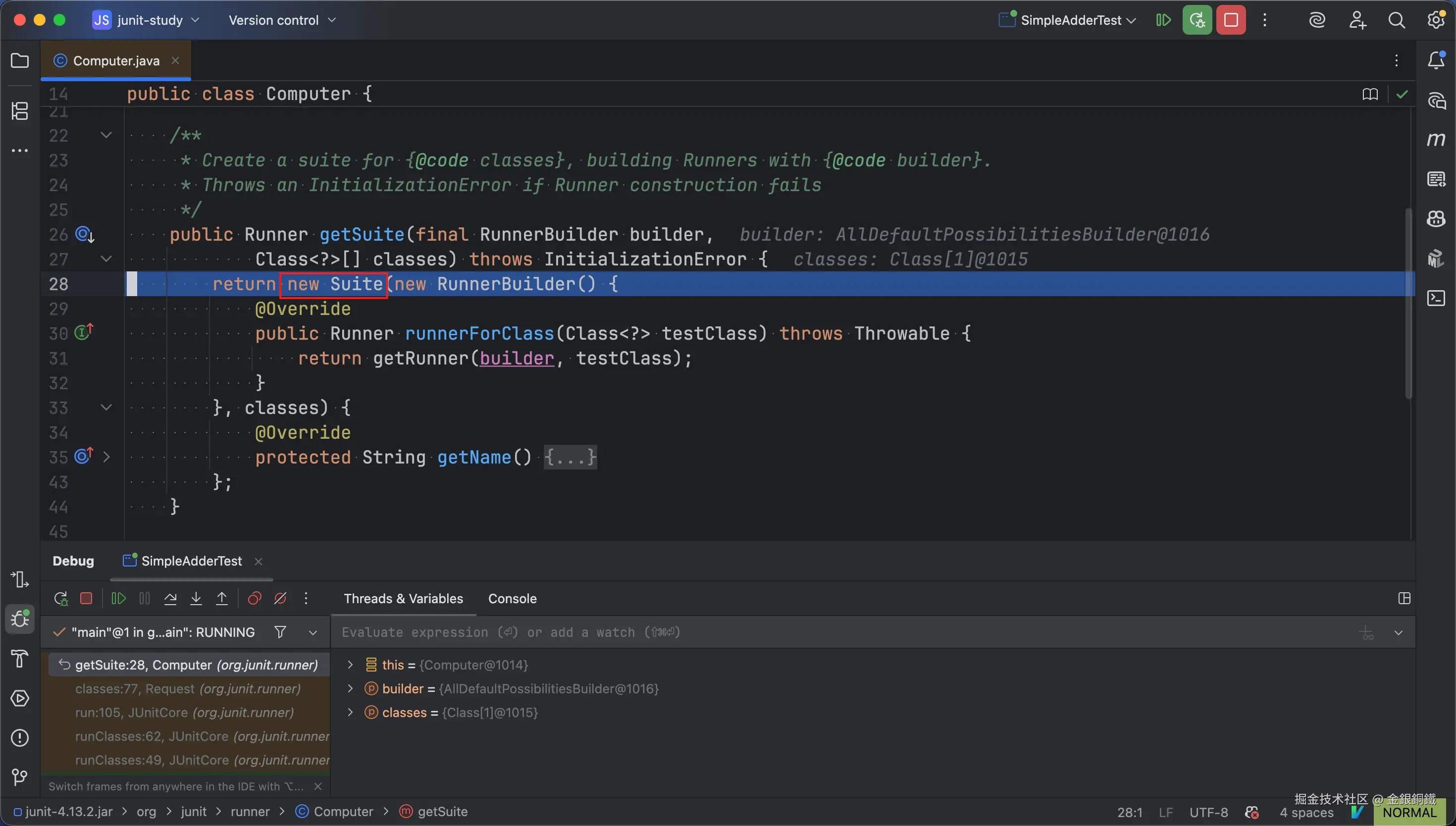 我们 Step Into Computer 类中的 getSuite(final RunnerBuilder builder, Class<?>[] classes) 方法