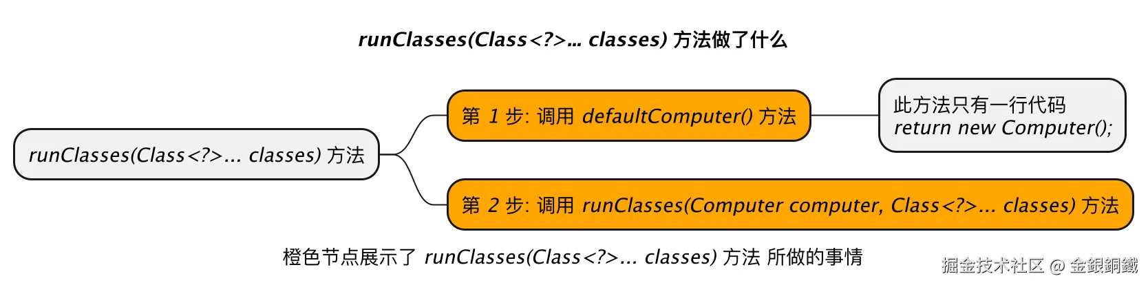 caption 橙色节点展示了 <i>runClasses(Class<?>... classes)</i> 方法 所做的事情