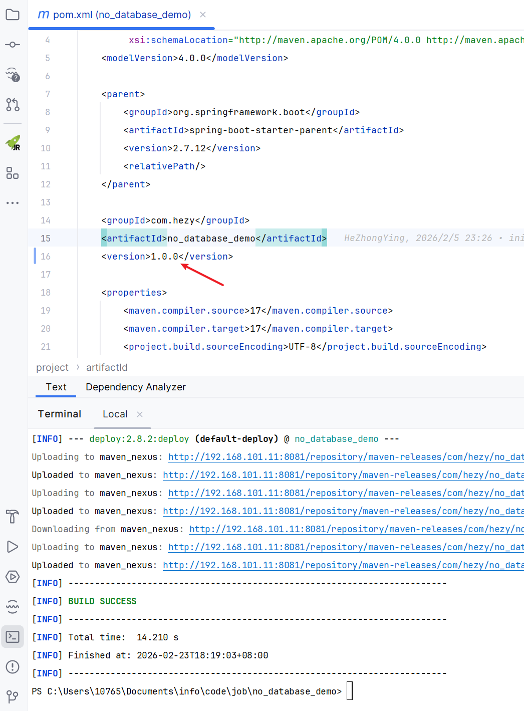 接下来,打开一个项目,在 pom.xml 文件中,添加以下内容,表示部署时将 jar 上传到私服的哪个仓库中。