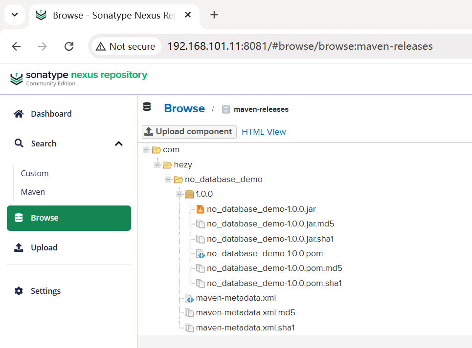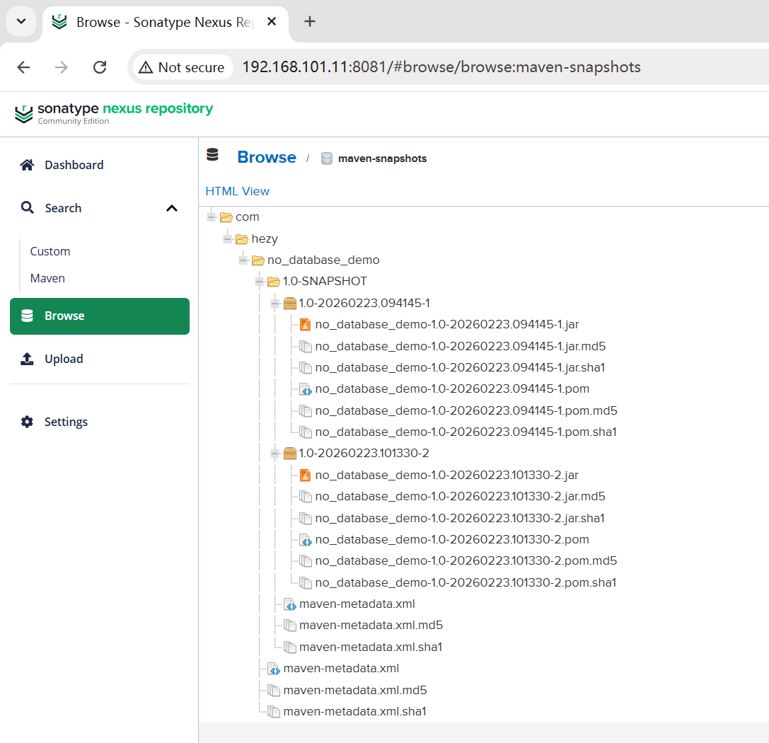 查看 nexus 快照仓库,可见该项目 jar 已被上传。