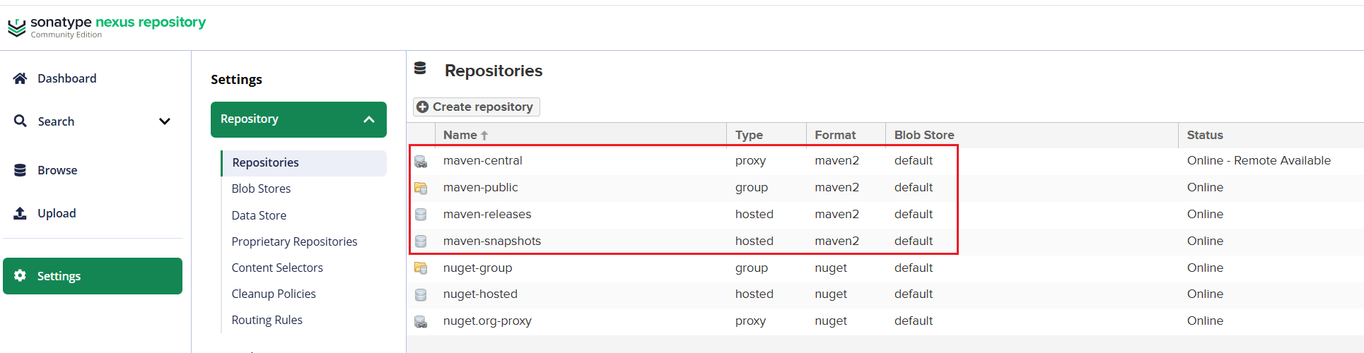 使用前,先介绍一下 nexus 默认创建的几个仓库。