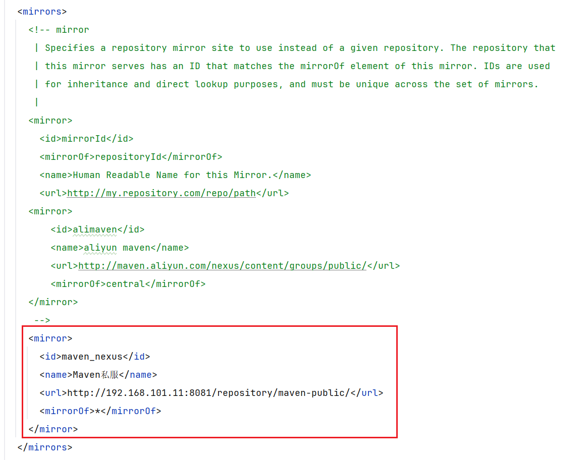 (1)在 mirrors 标签中增加一个镜像源,里面填写私服的信息。