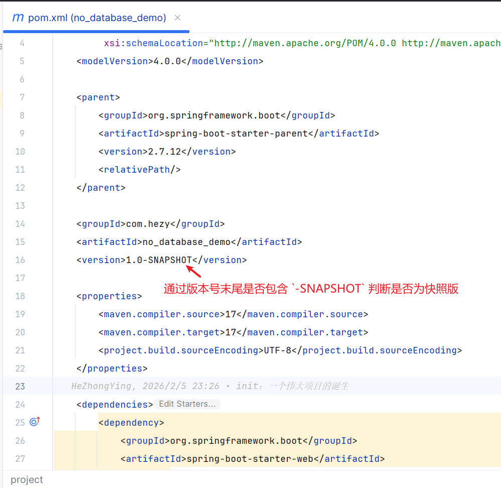 需要注意的是,Maven 是通过该项目的 version 末尾是否包含 -SNAPSHOT 判断是稳定版还是快照版的。