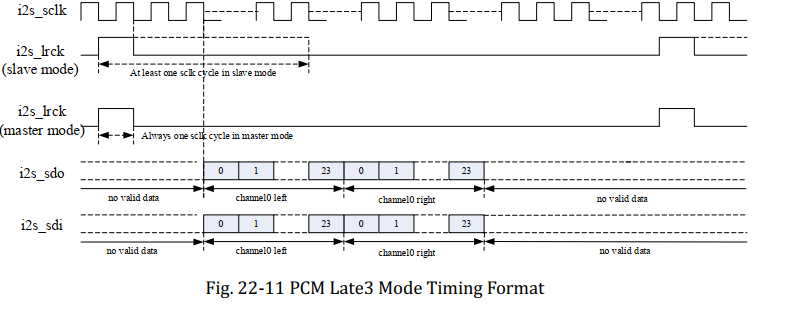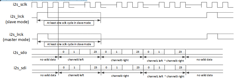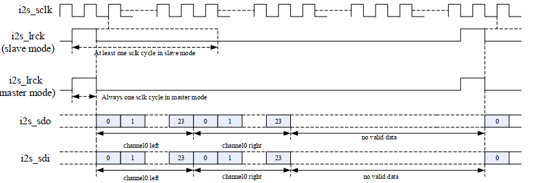 For LRCK (i2s_lrck) signal, it goes high to indicate the start of a group of audio channels. For SD (i2s_sdo, i2s_sdi) signal, it sends the first bit (MSB or LSB) at the same time when LRCK goes high. The range of SD signal width is from 16 to 32bits.