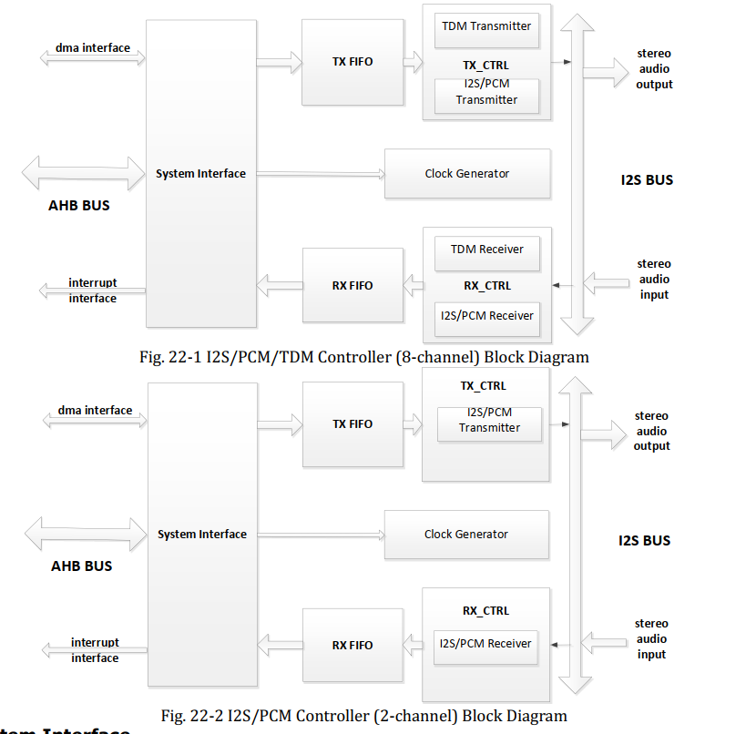 There are nine I2S/PCM/TDM controllers and two I2S/PCM controllers embed in the system. I2S/PCM/TDM controllers support I2S format, PCM format and TDM format.