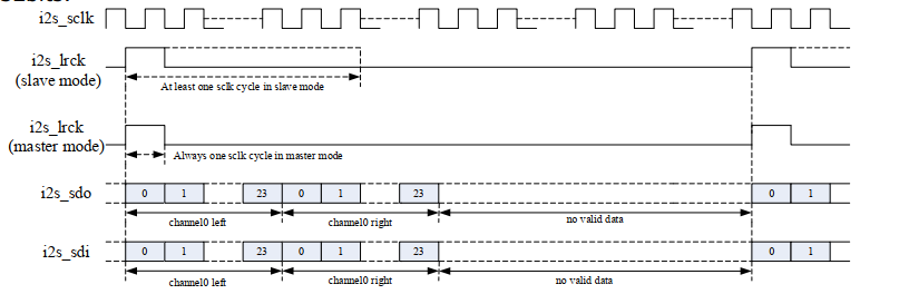 For SD (i2s_sdo, i2s_sdi) signal, it sends the first bit (MSB or LSB) on the second falling edge of SCLK after LRCK goes high. The range of SD signal width is from 16 to 32bits.