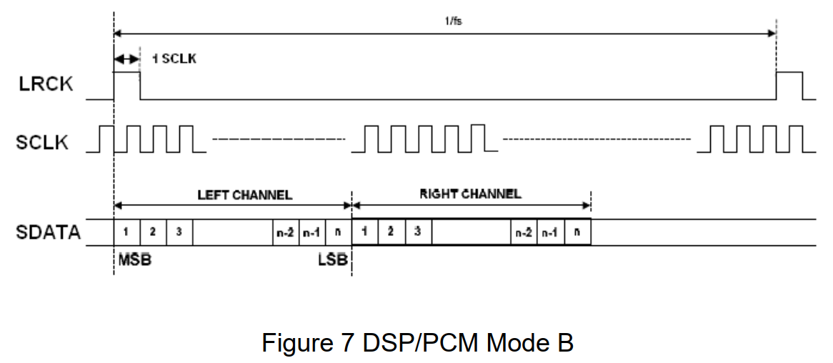 DSP A :帧同步脉冲后,延迟1个BCLK周期开始传输数据(类似于I2S的延迟思想)。