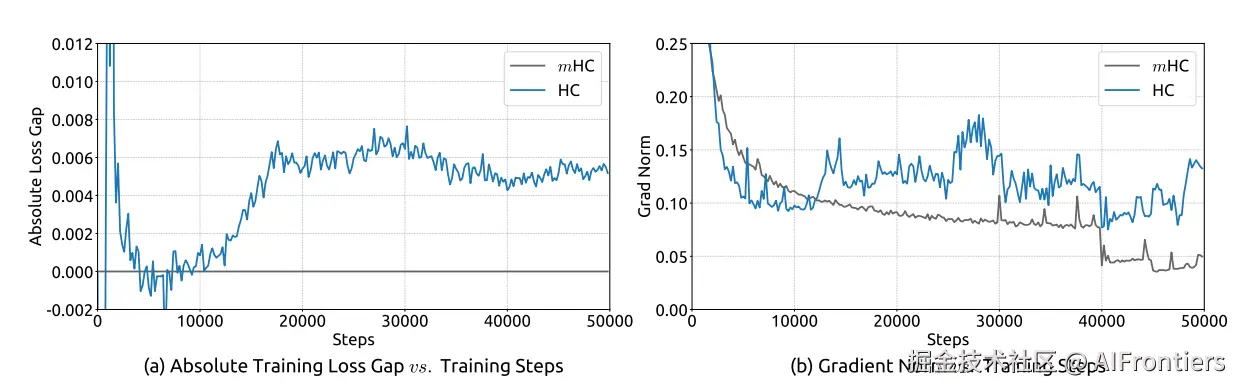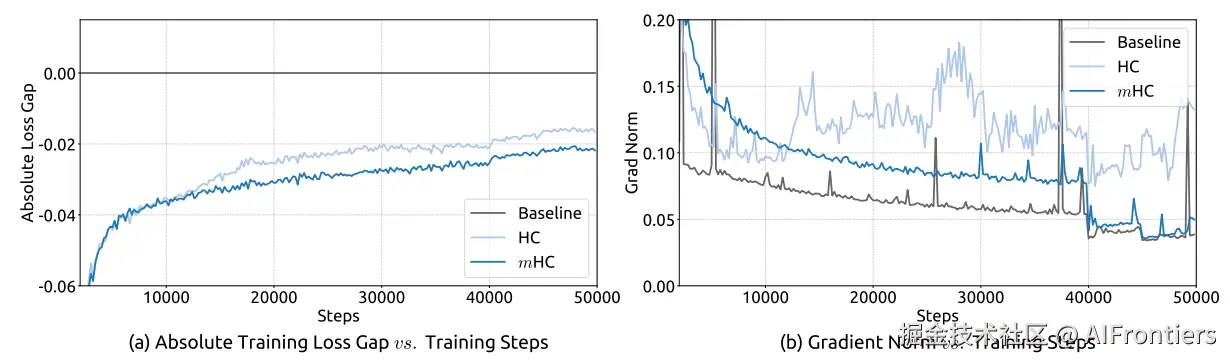 表 4展示了模型在多种下游基准测试中的性能表现。相比于基线模型,mHC实现了全面的性能提升,并在大多数任务上超过了HC。值得注意的是,与HC相比,mHC 进一步增强了模型的推理能力,在 BBH上实现了2.1%的性能提升,在 DROP上实现了2.3%的性能提升。