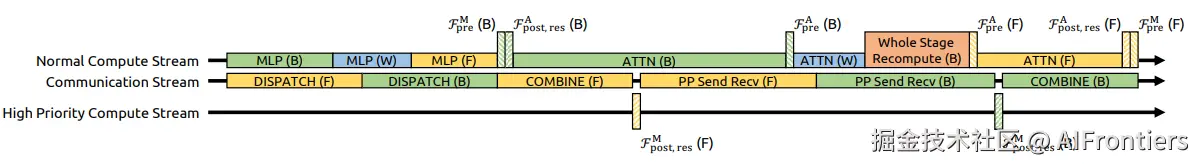 重叠执行:DualPipe巧妙地安排了任务,利用mHC计算的时间窗口,同时进行不同GPU之间的数据传输。