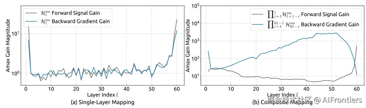 另外,由于 <math xmlns="http://www.w3.org/1998/Math/MathML"> H L − i r e s H_{L-i}^{res} </math>HL−ires矩阵是无约束的,可以往任意方向发散。论文测量了一个叫「Amax Gain Magnitude」的指标,在残差流里被放大了3000倍。在大规模训练中,这就是爆炸的前奏。