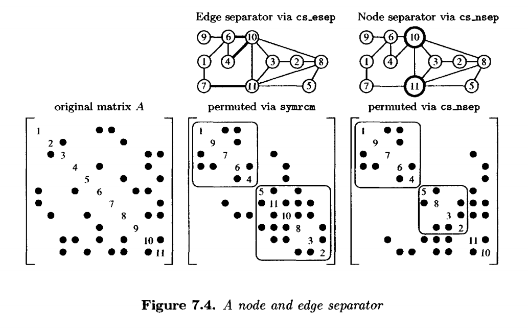 该方法可以选择节点覆盖为集合R₁ ∪ C₂ ∪ C₃或R₁ ∪ R₂ ∪ C₃,两者的大小都等于A12的最大匹配的大小(其结构秩)。S中的任何边都将至少与这两个集合中的一个节点相关联。cs_sep M文件选择R₁ ∪ C₂ ∪ C₃。在实践中,选择能最好地平衡左右子图大小的集合。CS_nsep M文件构造一个边分隔符并将其转换为节点分隔符。递归的CS_nd M文件使用CS_nsep找到一个节点分隔符,然后递归地对两个子图进行二分。小的图(阶数为500或更少)使用cs_amd排序。