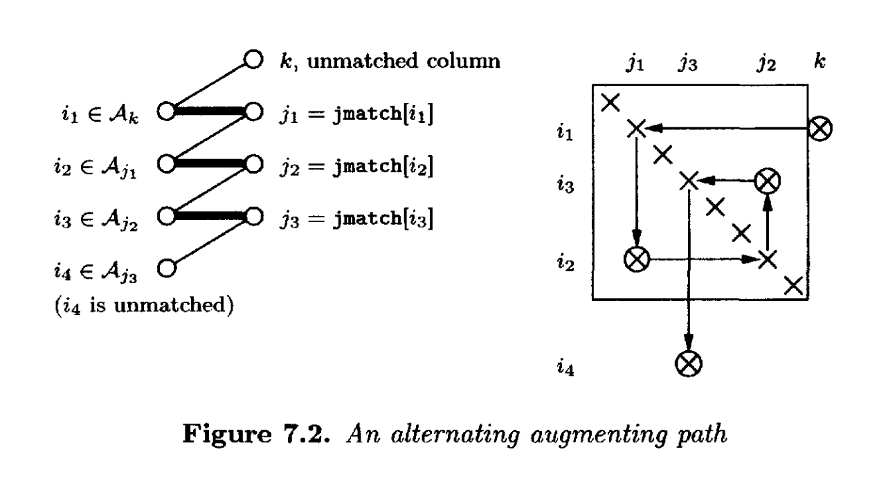 Cormen、Leiserson和Rivest [23] 描述了第7.3节讨论的scc算法。寻找图强连通分量的最早算法归功于Tarjan [194];Duff和Reid [59, 60] 实现了该算法。Gustavson [120] 讨论了最大匹配和Tarjan算法的一种实现。Duff [48, 49] 提出了cs_maxtrans使用的O(|A|n)时间最大匹配算法。Duff和Wiberg [71] 实现了Hopcroft和Karp [137] 的O(|A|√n)时间最大匹配算法,该算法在实践中并不总是比O(|A|n)时间算法快。Pothen和Fan [169] 比较了计算块三角形式的各种方法。Duff和Koster [57, 58] 提出了一种最大加权匹配。