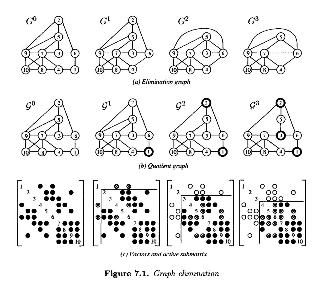 最小度是一种局部贪婪策略,或"自底向上"方法,因为它首先找到消去树的叶子。Tinney和Walker [196] 开发了第一种用于对称矩阵的最小度方法。注意,他们论文标题中的"最优"一词用词不当,因为最小度是一种非最优方法。其最早的高效实现是由George和Liu的算法(SPARSPAK中的MMD及其前身 [85, 87, 91])。其他实现包括YSMP(Eisenstat等人 [73] 和 Eisenstat, Schultz, and Sherman [76])和MA27(Duff, Erisman, and Reid [53] and Duff and Reid [62])。