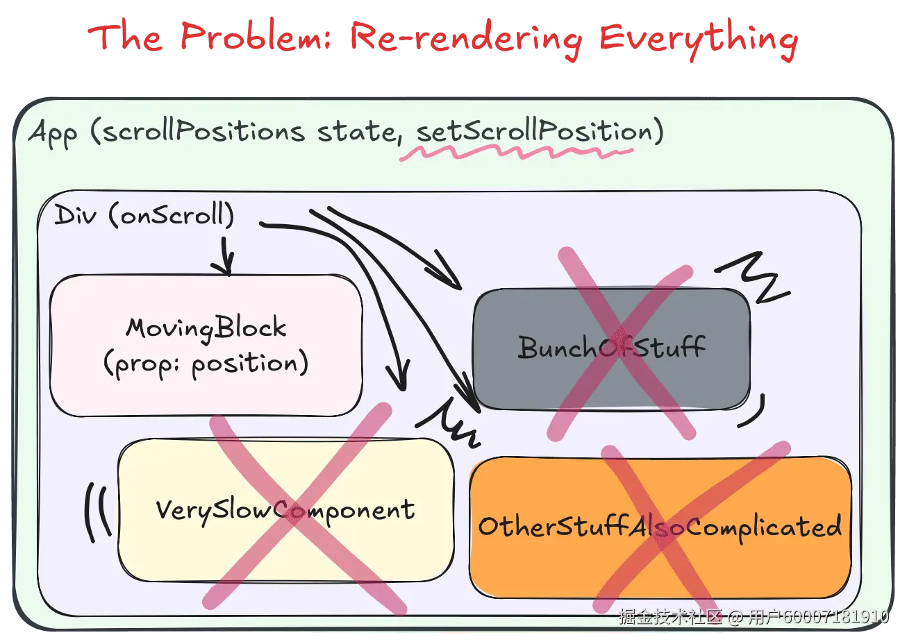 上述实现方式会让页面的拖动体验变得非常卡顿。鼠标的每一次移动都会触发状态更新,进而导致Dashboard组件重渲染;而Dashboard重渲染时,其内部嵌套的所有子组件也会跟着重渲染。