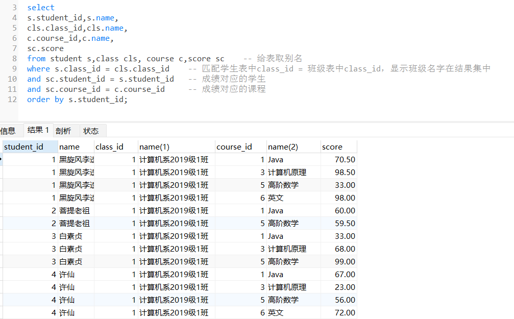 学生id,学生姓名,所有班级名,课程,对应的成绩