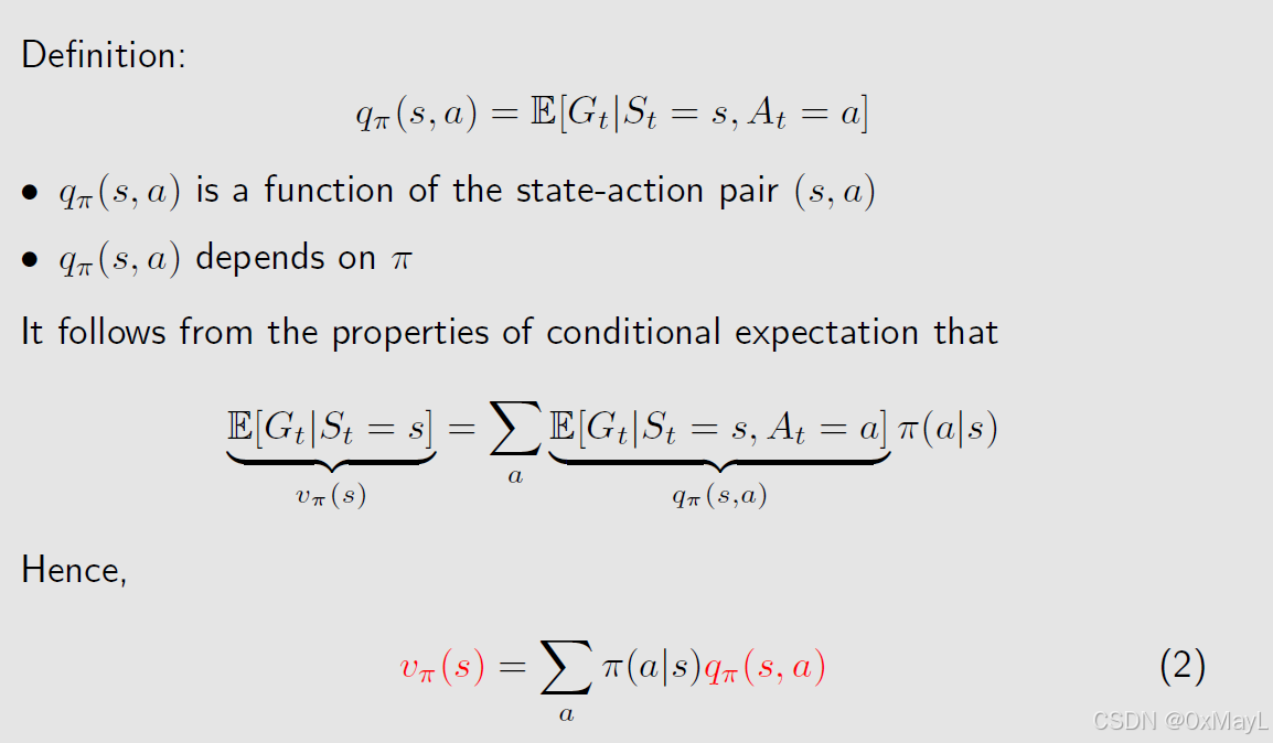 - 核心思想与状态价值函数一致:都是未来期望的累积折扣奖励,在此基础上给定了某个状态和采取的动作 。
