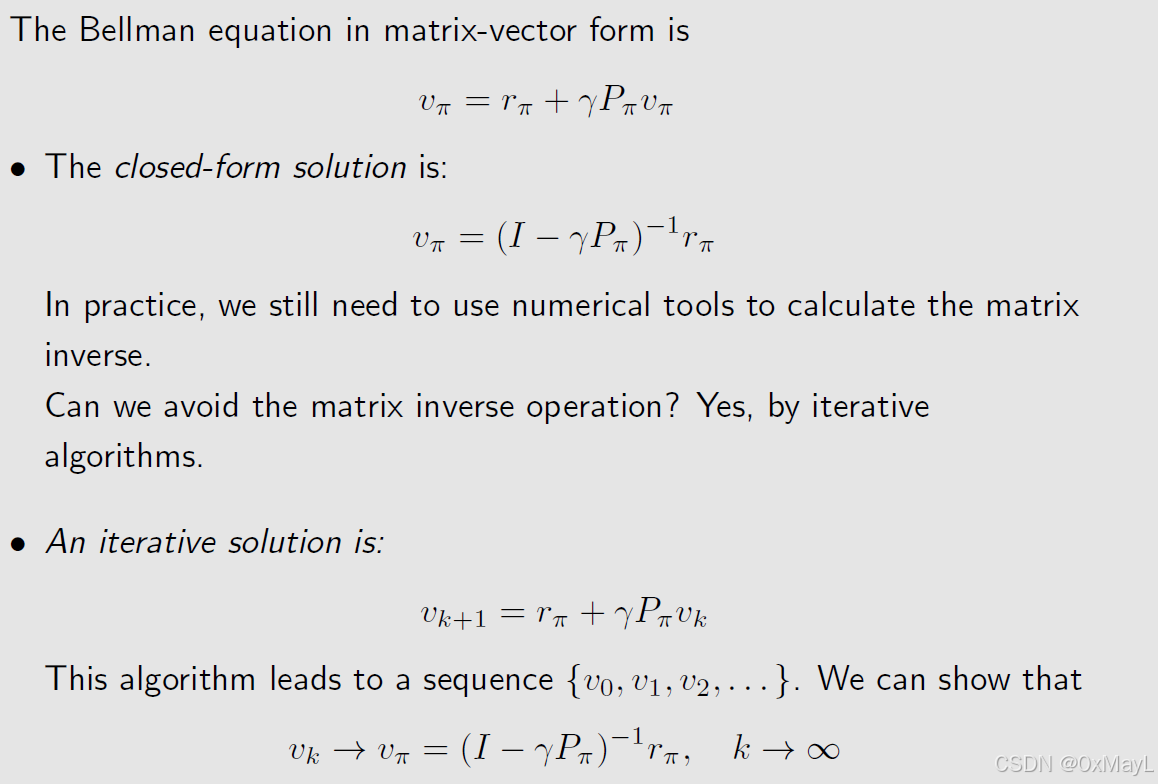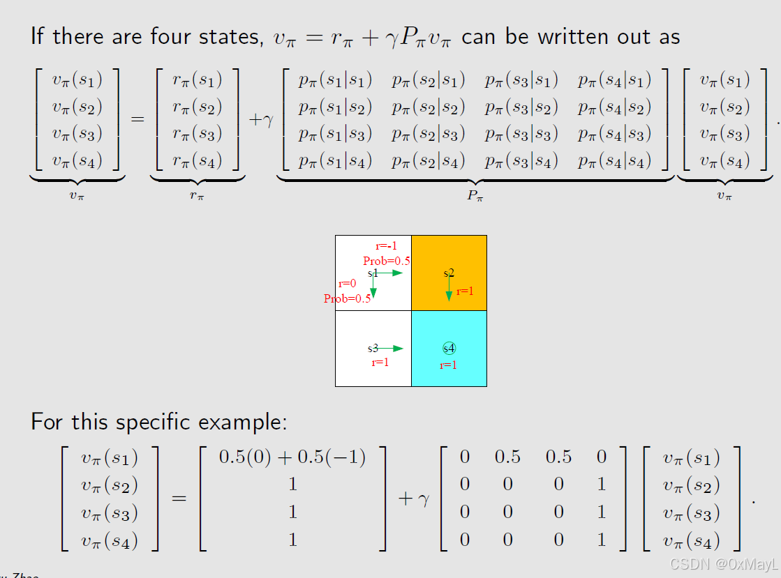 - 特别的性质:贝尔曼方程对于所有状态都适用 ,如果我们知道策略,对于所有者状态都列举方程,可以通过求解线性方程组的形式求解贝尔曼方程。