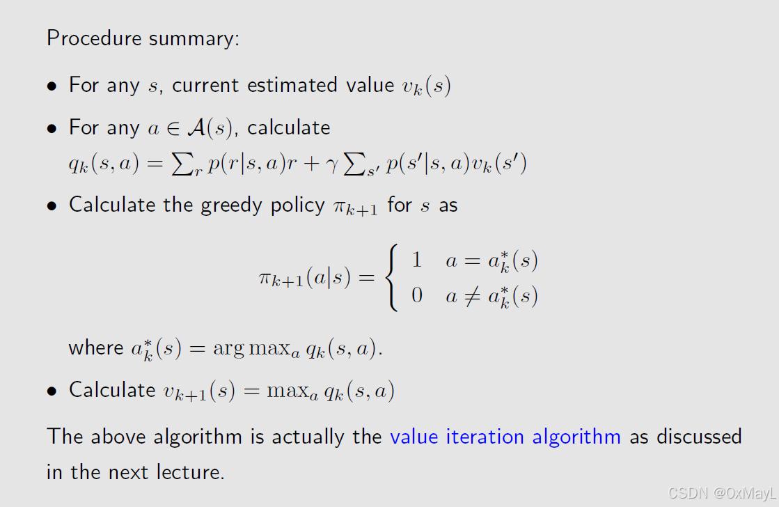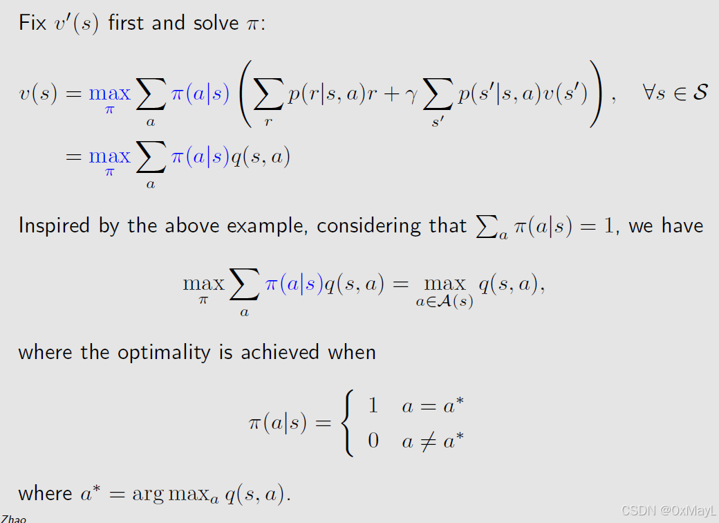 - 原因很简单,贝尔曼方程可以简化为Q-value的加权和,我们只需要让Q-value最大的权重为1就能实现最优策略( π ( a ∣ s ) = 1 when Q ( s , a ) is maximum \pi(a|s)=1 \text{ when }Q(s,a) \text{ is maximum} π(a∣s)=1 when Q(s,a) is maximum) 。