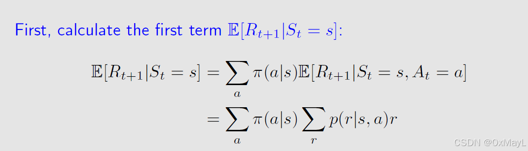 - r π ( s ) r_{\pi}(s) rπ(s)代表状态s下的期望即刻奖励,注意没有确定动作。