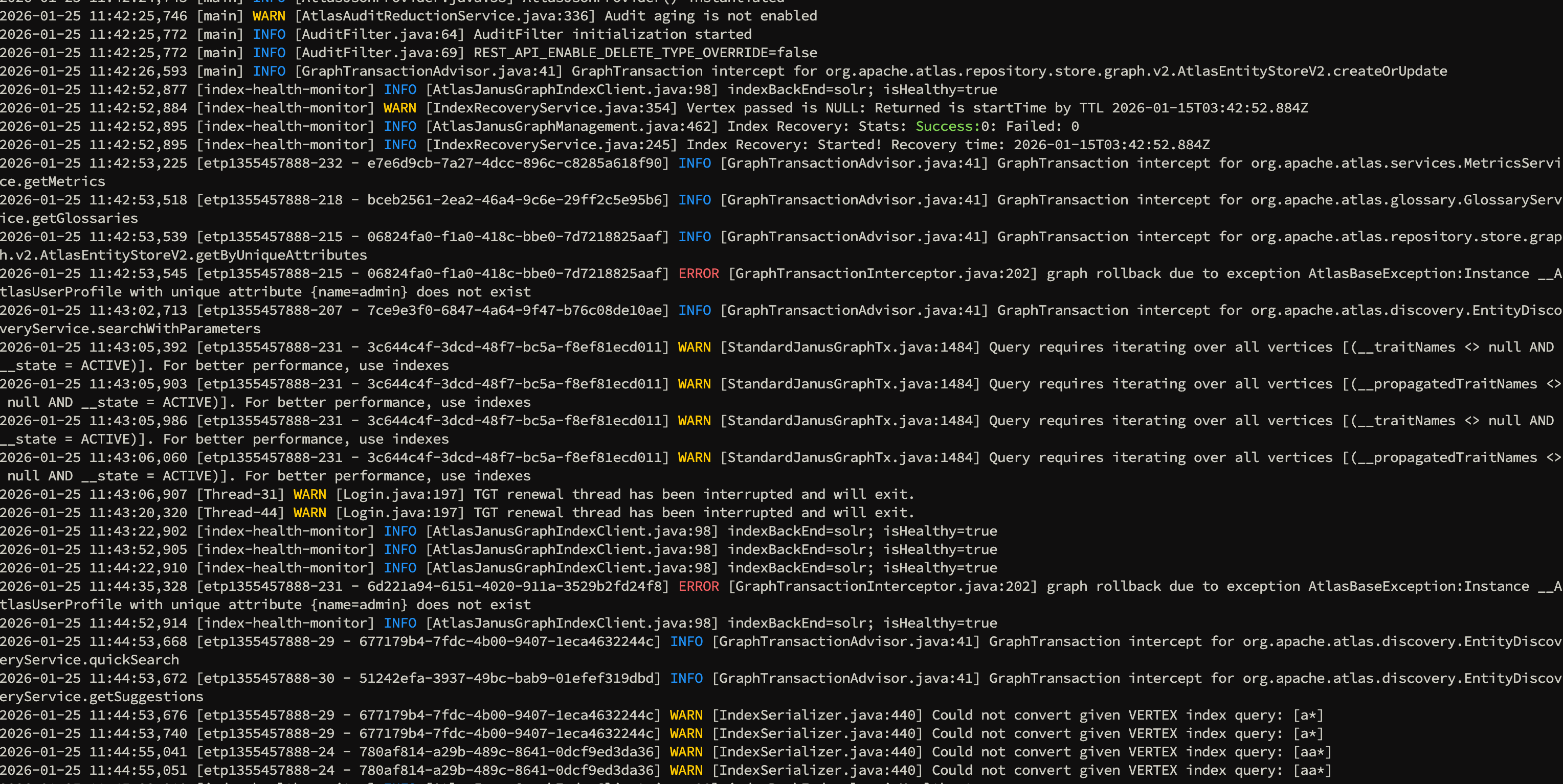 2026-01-25 11:45:22,919 [index-health-monitor] INFO [AtlasJanusGraphIndexClient.java:98] indexBackEnd=solr; isHealthy=true