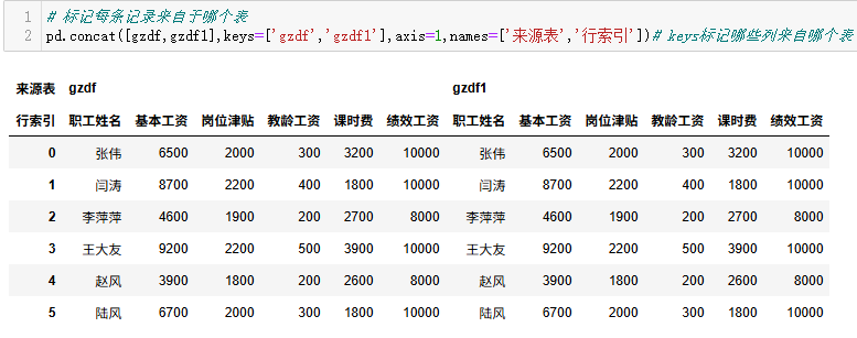 pd.concat([gzdf,gzdf1],keys=['gzdf','gzdf1'],axis=1,names=['来源表','行索引'])# keys标记哪些列来自哪个表