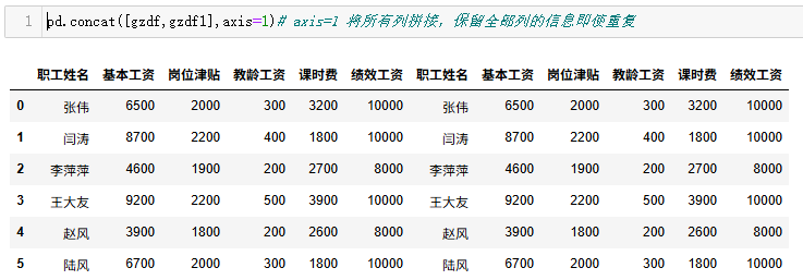 pd.concat([gzdf,gzdf1],axis=1)# axis=1 将所有列拼接,保留全部列的信息即使重复