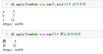 df.apply(lambda x:x.sum())# 默认按列求和