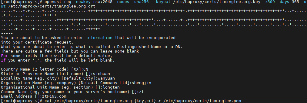 [root@haproxy ~]# openssl req -newkey rsa:2048 -nodes -sha256 -keyout /etc/haproxy/certs/timinglee.org.key -x509 -days 365 -out /etc/haproxy/certs/timinglee.org.crt