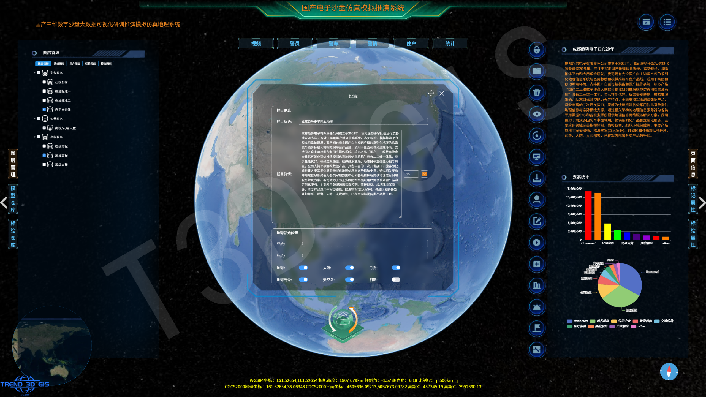 三维电子沙盘智能交互式可视化动态主界面系统:主界面菜单实时一键隐藏;主界面右视窗可自定义录入业务资料数据并可以调整字体大小和颜色(人员、内容、相关情况等),主界面上视窗顶栏和左边栏可以修改主界面名称、更换主界面图标;主界面左视窗和右视窗可以分图层的形式搭配矢量电子地图大数据,并可视化动态效果图展示,可展示要素统计、要素走势,并可以自定义重点关注地图数据属性,可以隐藏左视窗和右视窗;可以自定义地球初始位置